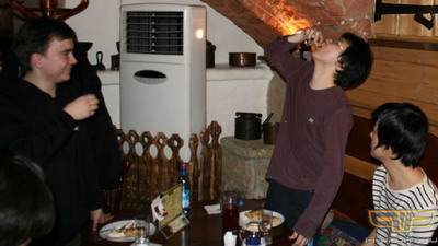Конечно же, после такого количества жидкости, блинчики ели не очень активно, хотя Свит успел съесть свои и зацепить из тарелки Шая. На вопрос о том, что заказать еще, Шай вдруг ответил, что хочет еще водки! В этом его поддержали Феня и Сеня, и мы снова имели возможность лицезреть, как корейский прогеймер демонстрирует дедовский способ опрокидывать стаканчик-другой.